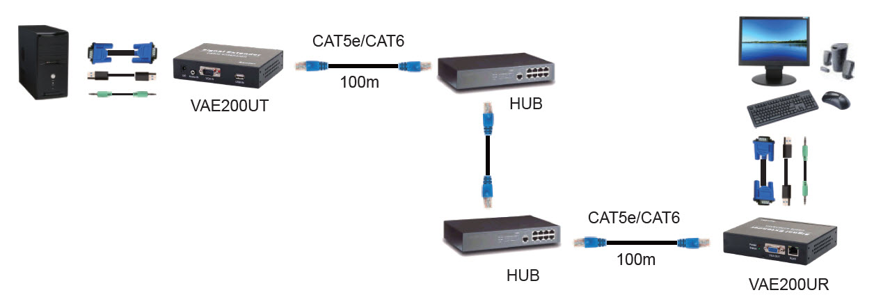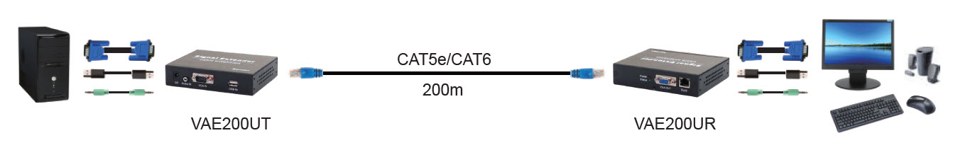 ● 可以將近端的 ( VGA+Audio+USB ) K.V.M 訊號延長器影音訊號透過一條 CAT5E/CAT6 UTP 纜線延長