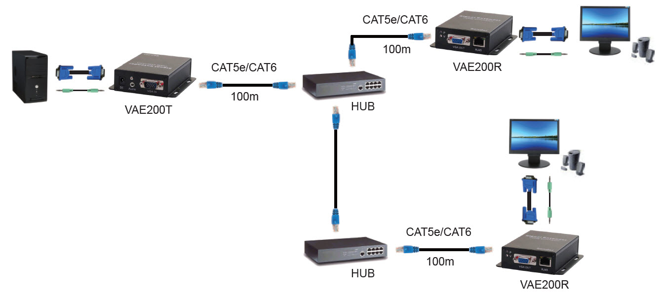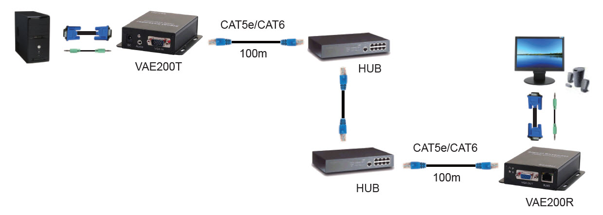 1對1:透過一條 CAT5E/CAT6 UTP 纜線最遠傳輸距離可達 200 公尺;