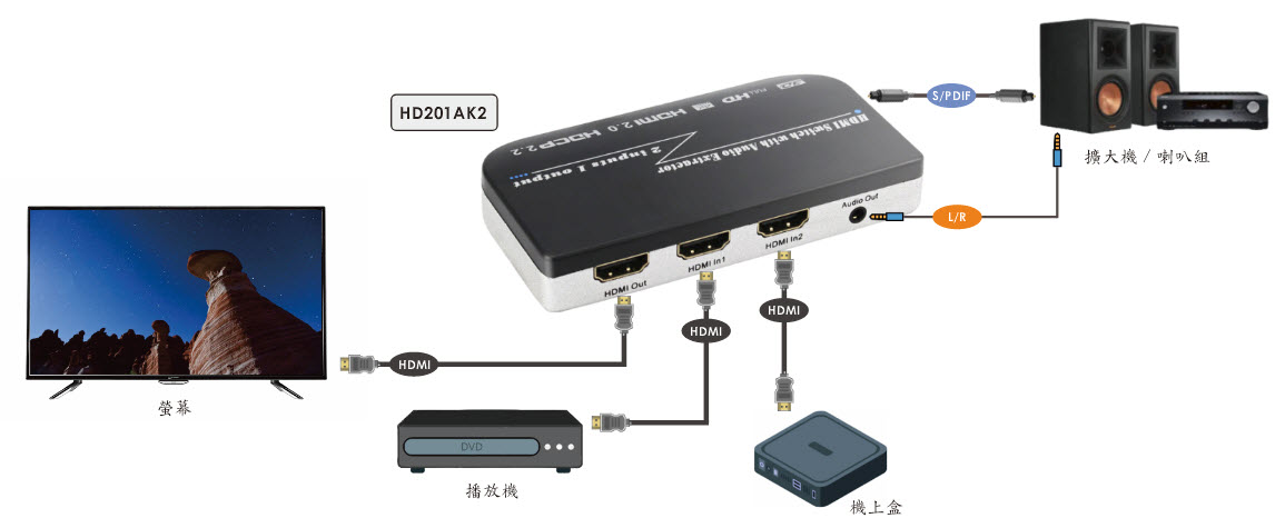 ● 可將 2 組 HDMI 數位影音訊號來源,切換至 1 台顯示器設備。