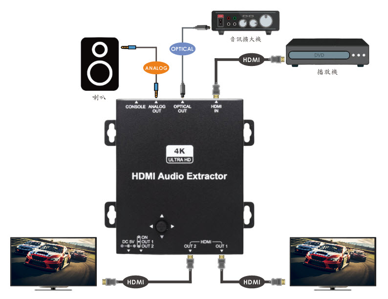 ● 支援 HDMI 輸出埠音源擷取功能: 類比 ( 3.5mm Phone Jack )、數位 ( TOSLINK )。